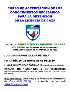 El sábado 16 de noviembre se impartirá en Navalvillar de Pela el curso para la obtención de la licencia de caza. Será impartido por la Federación Extremeña de caza. Para inscripciones llamar directamente a la federación.